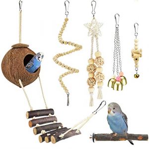 KATUMO 6 Pcs Bird Parrot Toys, Natural Wood Coconut Bird House with Ladder Hanging Swing Pet Climbing Rotated Ladder Chewing Bells Bird Toys for Parakeet, Conure, Cockatiel, Mynah, Love Birds, Finch