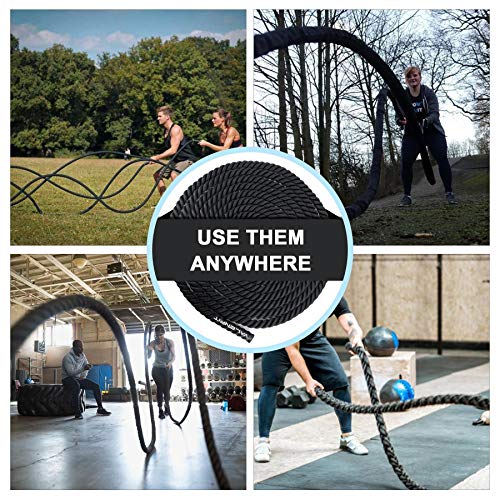 • 2020 UPGRADE BATTLE ROPE -The ropes material, 100% DACRON is durable without being stiff. Heavy-duty coated handles to protect your hands and give you a secure grip for all training and exercises! Made of high-strength grade industrial polyester so you can use on concrete. The battle rope is 3-STRAND TWISTED DESIGN with a high tensile strength that prevents breaking, fraying, or coming to lose.