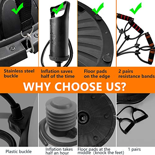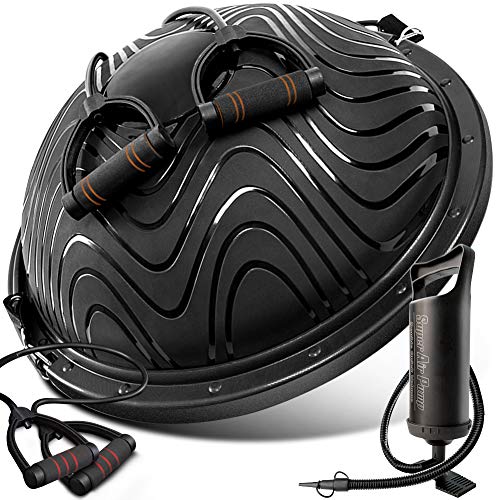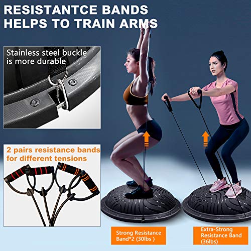 - Dual Excerise with Different Strength Resistance Bands–Use the half yoga ball with the flat side down to stand on for simple balance building, using a basic stance, or push steps. Advance your routine by doing squats, lunges, or using for crunches. Take it even further by flipping the trainer over and using for planks or burpees. Choose different strengths resistance bands aim at tone and strength your arms, shoulders, back and abs.