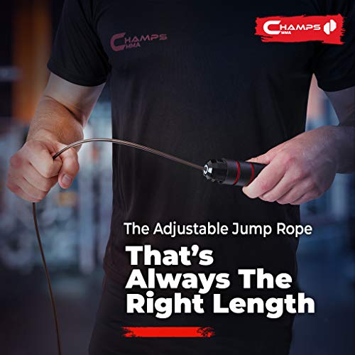 • ADJUSTABILITY AT ITS FITTEST – Stop sparring with home exercise equipment that’s the wrong fit. Pick the perfect MMA training partner with Champs MMA’s easily adjustable boxing jumping rope!