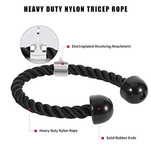 • ✅Nylon Braided Tricep Rope – made of heavy-duty black nylon braided rope with solid rubber ends and chrome plated swivel attachment provides fluently rotating movement. Weight Capacity: Up to 800 lbs