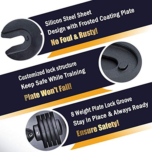 - 【New Structural Design】 Exclusive design of adjustment countweight plate, simply adjust by holding the handleaccording to the weight you need, turn the pointer to the corresponding number to adjust. 8 locks structure design can ensure the weight plate won’t fall off during exercise.