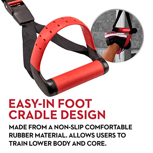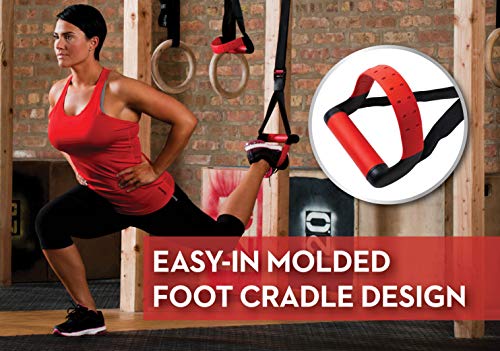 The Jungle Gym XT secure and adjustable buckle allows for quick change of strap length from 16” for chin-up/pull-up to 8’ feet for movement between exercises and positions. The ergonomic handles also incorporate an Easy-In Foot Cradle made from a non-slip comfortable rubber material. It also includes an integrated cinch loop attachment with door anchor which allows easy, safe, non-scuff connection to doors, Lifeline Metal Wall Mounts, bars or tree limbs.