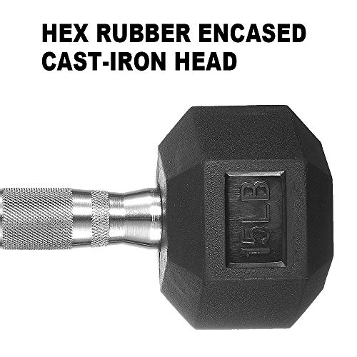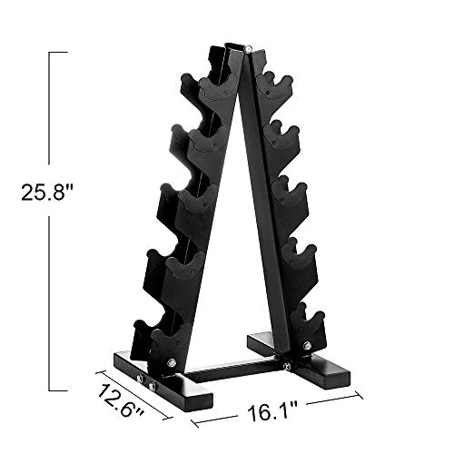 - SET INCLUDES: A pair of 5-pound 8-pound 10-pound 12-pound and 15-pound rubber hex dumbbells and a dumbbell rack.