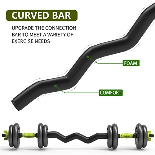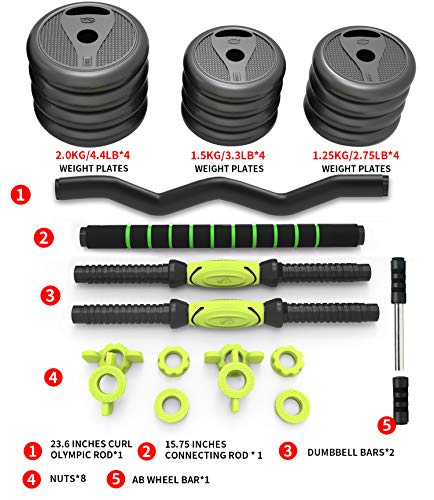 - 【4-in-1 Dumbbell To a Barbell】 This Adjustable Dumbbells set can be connected by the connecting rod and become a barbell or an AB Wheel to meet the needs of the upper and lower body workouts, which helps tone and sculpt your abdomen, arms, shoulders, back, chest and leg. This hand-held design allows you to do dumbbell, barbell training, Ab rolling and even single-use movements to build your muscle and Abdomen at home or office.