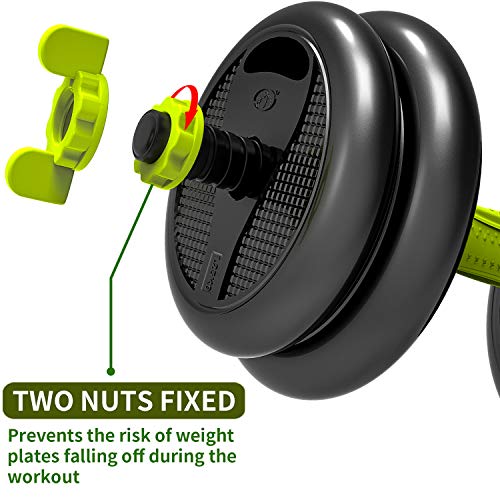 - 【Double Nut Anti-Slip Design】 there is many bump slot on the nuts which will fit tightly when you tighten the two nuts, it can also prevent you from the risk of weight plates falling off during the workout. To bring you a better experience, we give you an extra set of non-slip nuts as a spare.