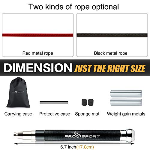 - YOUR ULTIMATE PACKAGE INCLUDES: Your Pro Sports High Speed Jump Rope includes; (2) slim aluminum handles, (2) 10ft coated steel cables, (2) weights to insert in handles for added comfort and control, drawstring carrying bag and a protective case. Everything you need for the ultimate impact on your fitness goals!